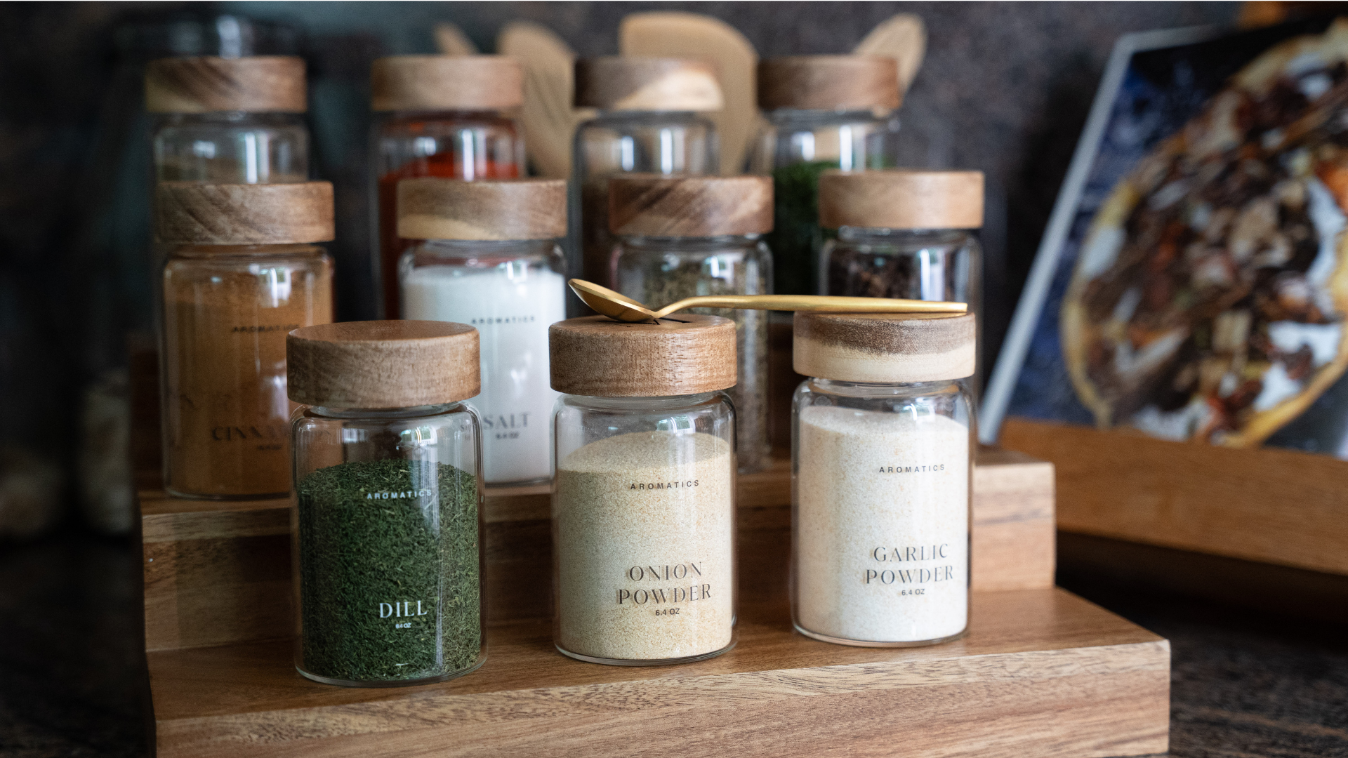 Choose uniform jars: The Polished Jar’s spice jars are the perfect size for drawer organization. Their flat tops and clean lines help maximize space, while the optional shaker inserts make pouring an easy task.