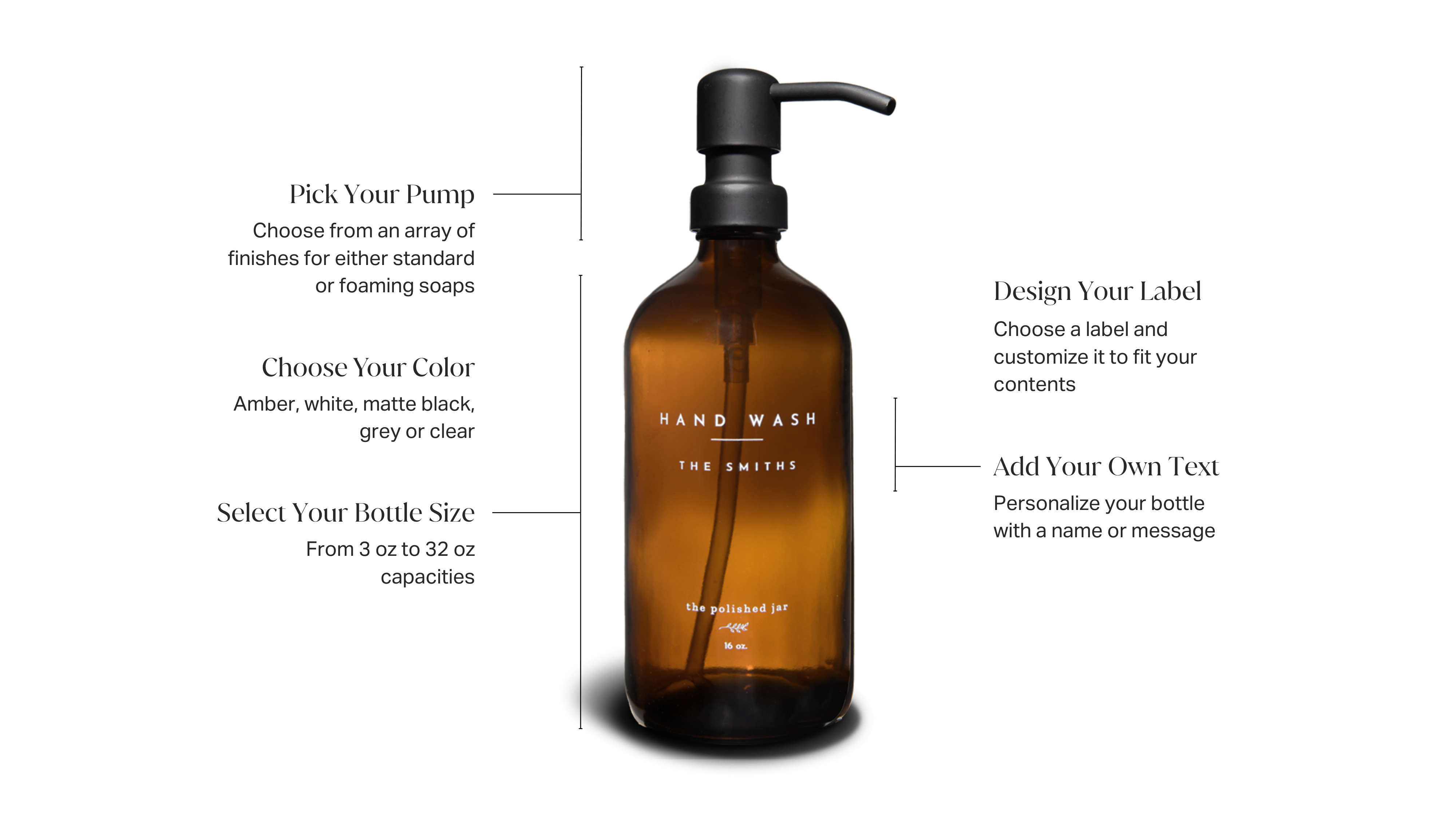 Try our online builder to mix and match colors, finishes, and labels—and design a bottle that fits your space effortlessly.